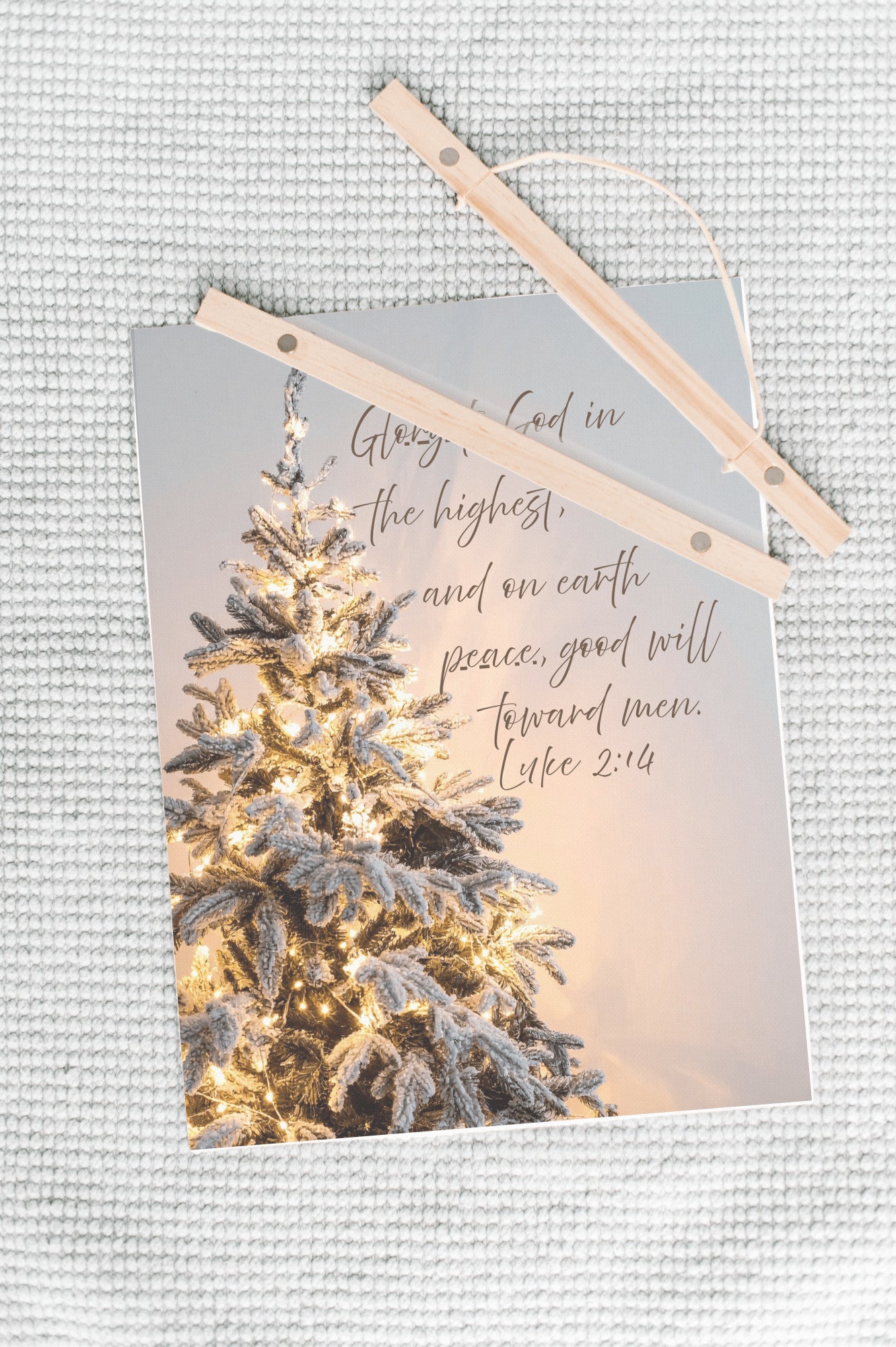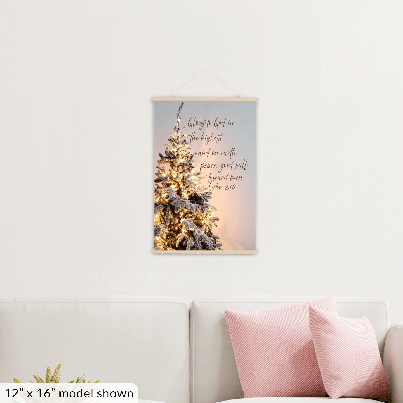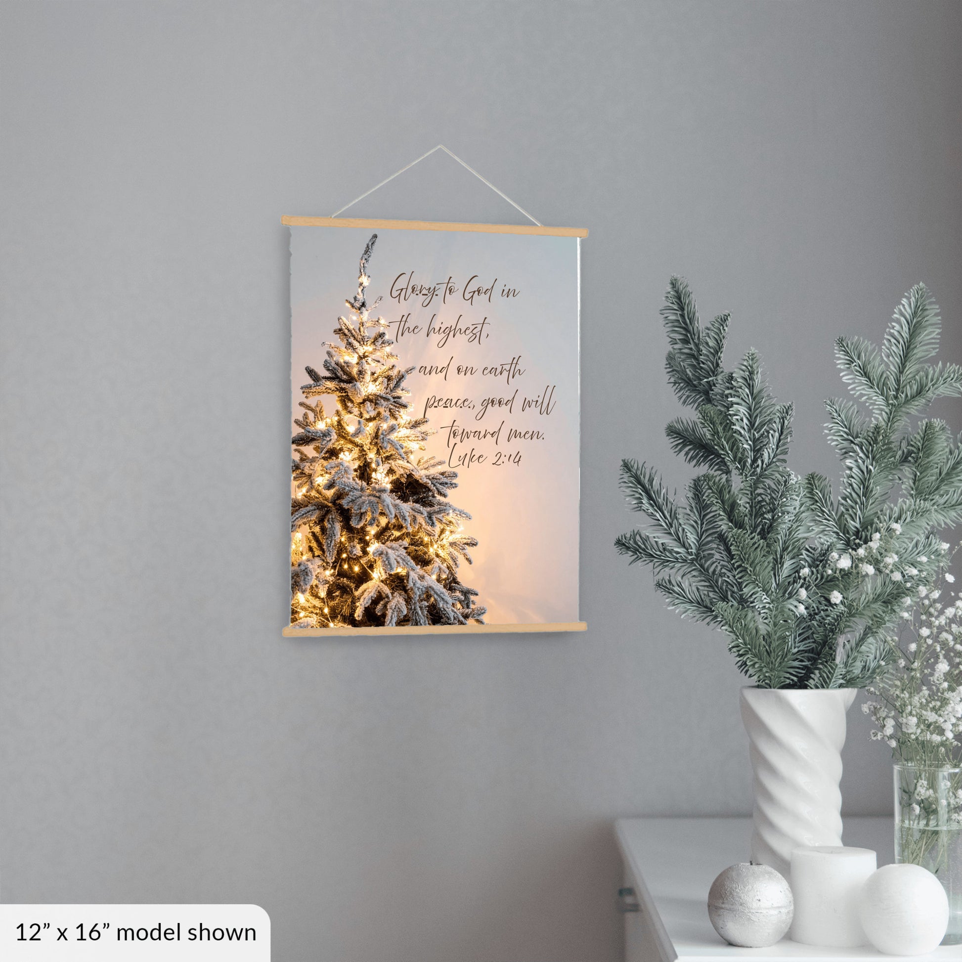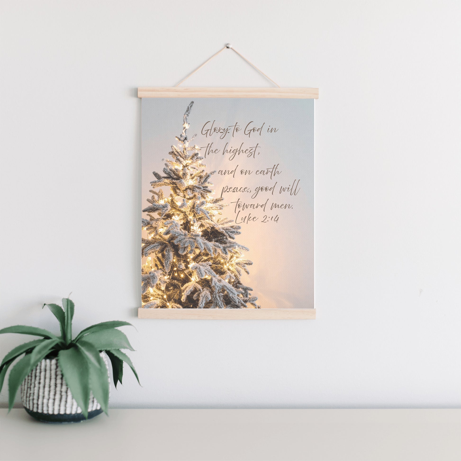 Celebrate the true meaning of Christmas with this elegant hanging canvas featuring the timeless scripture from Luke 2:14: “Glory to God in the highest, and on earth peace, good will toward men.”