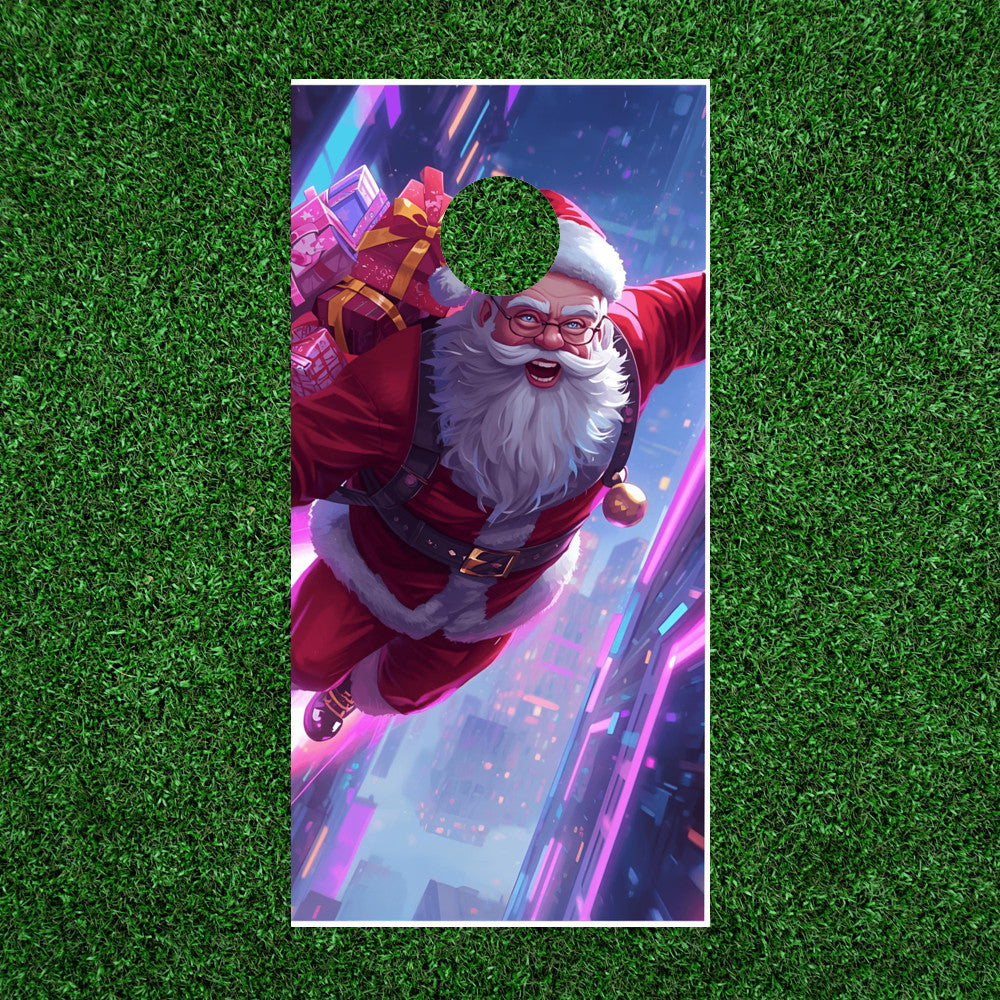 This exclusive design captures Santa mid-flight through a futuristic city skyline — gifts in hand, beard flowing, and neon lights reflecting the excitement of Christmas Eve.